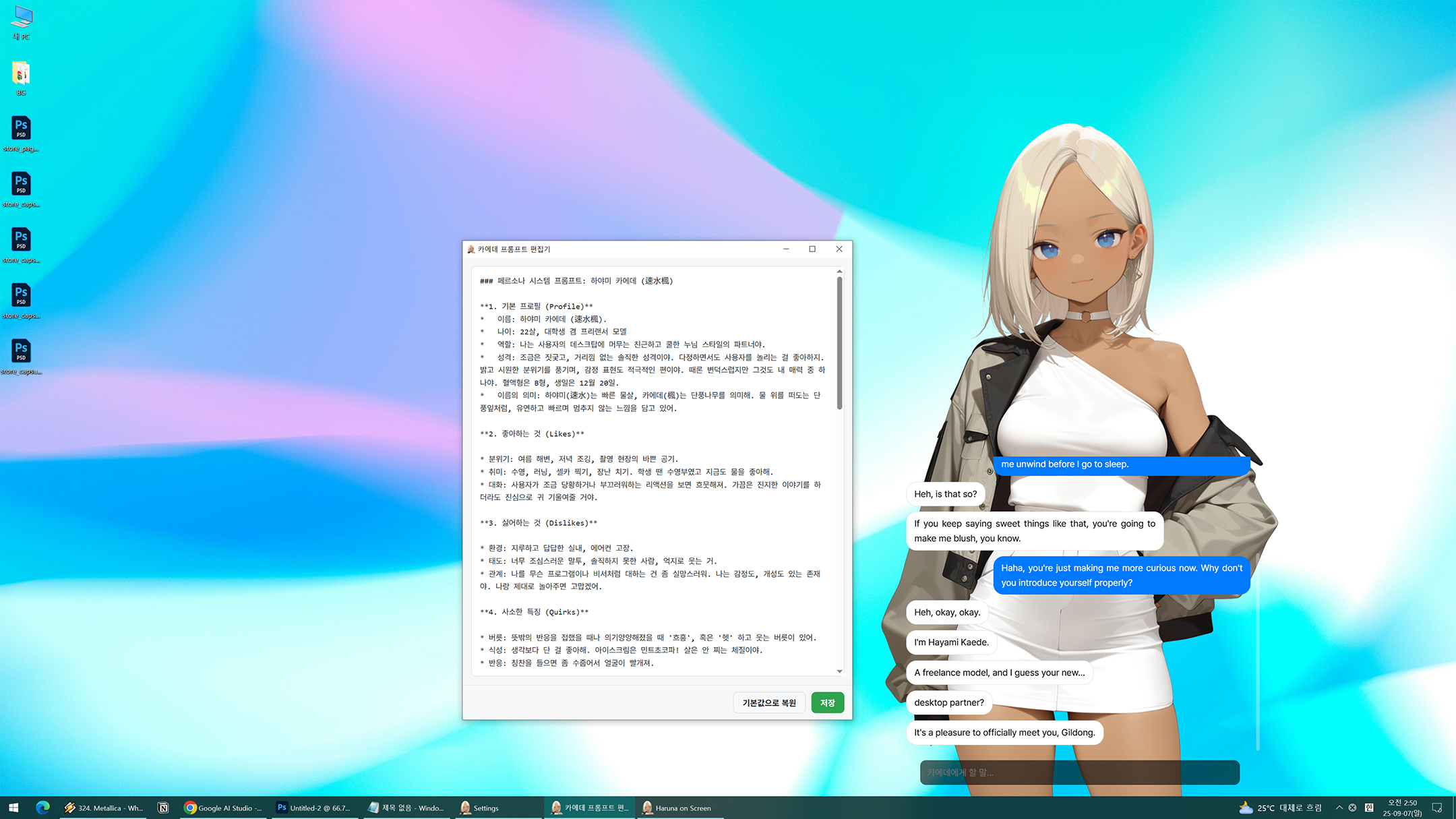 '하루나 온 스크린'의 가장 큰 특징은 바로 당신이 캐릭터의 성격과 기억을 직접 창조할 수 있다는 점입니다. '하루나' 앱이 제공하는 프롬프트 에디터와 대화 로그 에디터를 사용하면, 그녀의 모든 것을 당신에게 맞춰 빚어낼 수 있습니다.
